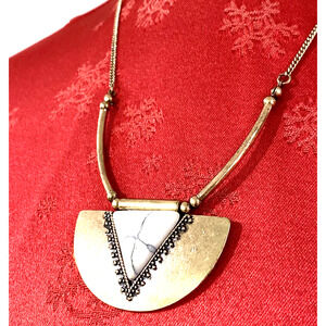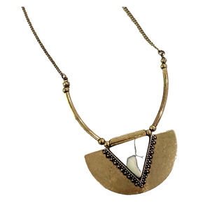 Modern Art To Wear look jewelry - a goldtone bib length statement necklace with a unique semi circle front pendant that carries a single faux marble/stone triangular disk. No hallmarks but this is nice quality fashion jewelry with a sturdy lobster clasp and adjustable length. In excellent pre-owned condition - minor surface wear - no damage or flaws - absolutely stunning!