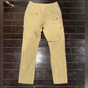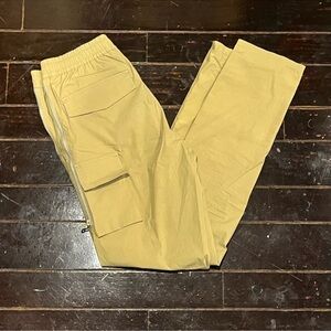 Zipper down the side of pants, small parachute pocket, small metal buttons