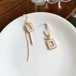 Turn heads with these stunning asymmetrical geometric drop earrings, crafted with a modern aesthetic and high-quality materials. Featuring a unique mismatched design, these earrings combine rectangle and circular elements with sleek gold-tone accents for a bold, fashion-forward look.