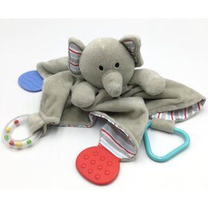 Plush gray fabric square with red/white/blue stiped backing and teething toys on each corner. Has a sweet matching elephant head on top.