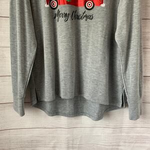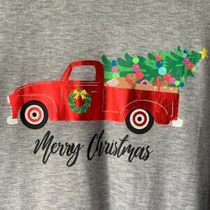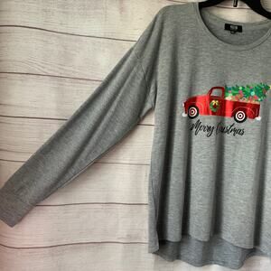 Gray long sleeve holiday shirt by Modern Canvas. This Christmas shirt has a red metallic-like or shimmery truck on the front. The truck is carrying a Chrismas tree, candy cane, and packages in the bed and has a wreath on the side. It says MERRY CHRISTMAS under the truck. The back of the shirt is blank. The shirt has a rounded neckline with a small scoop in the front, small side slits at the bottom, and the bottom has a high low hemline. It is pre-owned and in great condition.