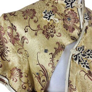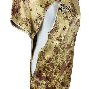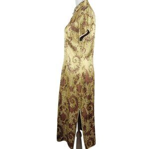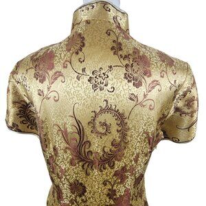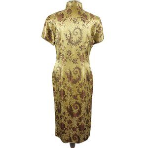 Gold Cheongsam Dress Womens 38 Embroidered Floral Design Short Sleeve Side Zip embroidery. Offers a cultural touch with its traditional design and short sleeves.