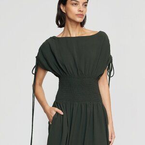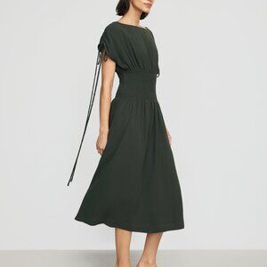 Chic forest green midi dress. Features gathered waist and stylish tie accents. Ideal for versatile wear.