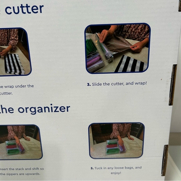 Fits Gallon, Quart, Sandwich, Snack size Plastic Bags, and Plastic Wrap with cutter. Includes screws for hanging up on the wall. Still wrapped in factory protection wrap. Never removed.
