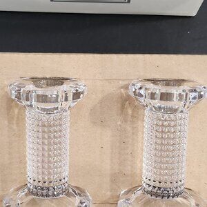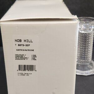 Stunning pair of Mikasa Crystal Candlesticks. These are called Nob Hill. They stand four inches tall. These beautiful candlesticks have a modern, contemporary look to them. Pillar section is a fine textured diamond point, smooth pattern. The top and bottom of the the crystal clear have an octagonal shape. But with 12 sides. These refract the light beautifully. Comes in original box. Condition is like new. Non smoking pet free home. ERC#11