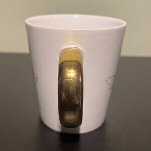 Modern Expressions white ceramic mug with both sides featuring a graphic of a metallic gold queen bee below a metallic gold crown. Large and comfortable, shiny metallic gold handle. Measures 4.25” tall with a 3.75” diameter. 5.5” across including the handle. Holds 16 fluid oz. From Modern Expressions; Walgreen Co.
