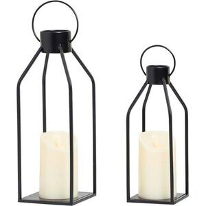 🧿【Dimensions】:Our decorative candle lanterns are elegantly handcrafted of sturdy black metal frame. They are great lanterns decor for indoors and outdoors. You can hang them up or use them as table lantern decor or as floor lantern decor. Including the handle, the larger one measures 4.5x4.5x15 inch, and the smaller one measures 3.86x3.86x12 inch. The included 2 candles measure 3x5inch. Each candle requires 3 AAA batteries(NOT included).