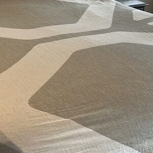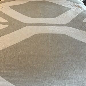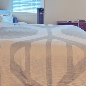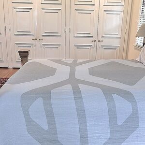 Soft organic cotton lightweight king size bed coverlet in light olive green and ecru geometric design.