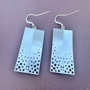Aesthetic: modern earrings, geometric dangle earrings, industrial jewelry, silver tone earrings, pierced cutout earrings, rectangular drop earrings, architectural earrings, sculptural jewelry, contemporary fashion jewelry, edgy style earrings, modern statement earrings, minimalist jewelry