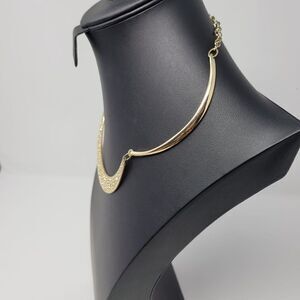 Elegant gold tone choker collar with intricate perforated filigree design, perfect for adding a touch of sophistication to any outfit. Lightweight and comfortable, this statement piece is a must-have for any jewelry collection.