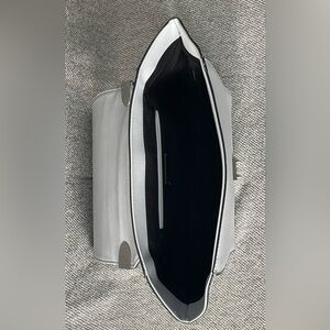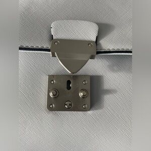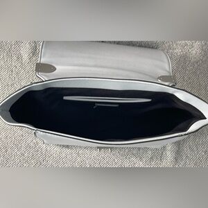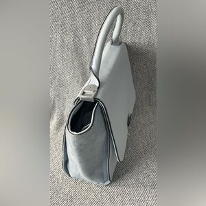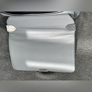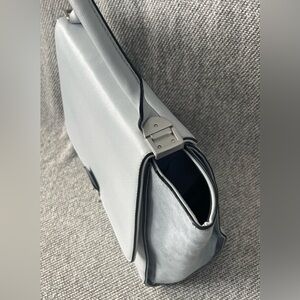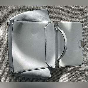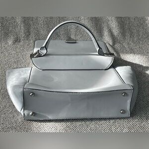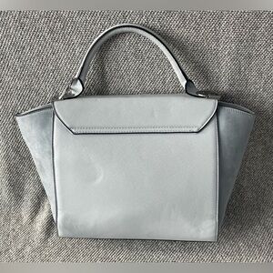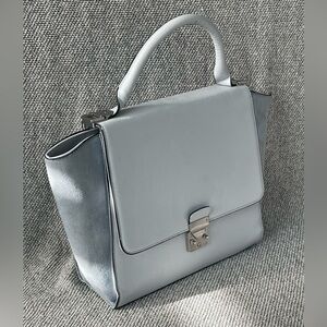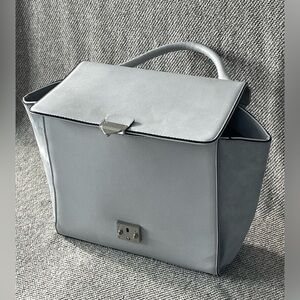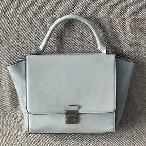 This elegant gray satchel showcases a distinctive trapezoid silhouette with extended sides, exuding a contemporary and minimalist charm. Made from premium materials, it features a top handle and a secure metal clasp closure, making it a chic and practical choice for any occasion.