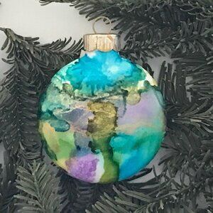 This uniquely colorful ornament will be quite the happy statement hanging on your tree! This glass ornament was hand painted by yours truly in a modern, abstract style. Colors include vibrant teal, blue, green, purple and gold. When you hold the ornament in your hand and see it on your tree you will get the full experience of how glowing the ornament truly is. Each ornament is signed on the neck of the ornament with the year of creation (SB 2025) and is a true collectors item that can be passed down for generations! This ornament is ONE OF A KIND. This ornament is a flat disk and measures approximately 2 1/2 inches wide and 3 inches in length from the top of the hanging cap to the bottom . A truly special piece to brighten the holidays year after year! #018