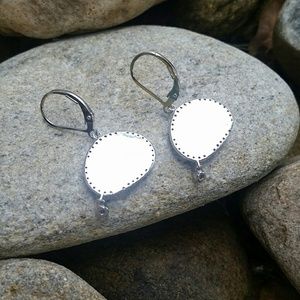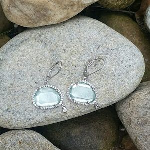 Talk about Unique! These lovelies are really special. They feature pale icy green centers surrounded by individually set high quality cz. Each one has a larger bezel set cz hanging from the bottom like a lovely dew drop! They are rhodium plated and very highly polished. High quality costume jewelry that would look divine with your Kendra Scott baubles!