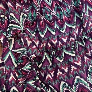 One ruffle shoulder and one spaghetti strap. Lined. Elastic banded at the waist. EUC