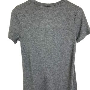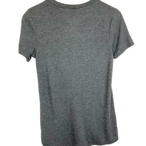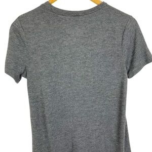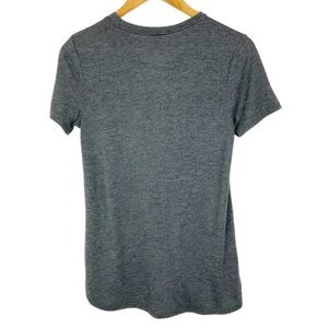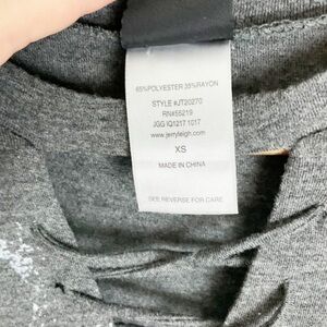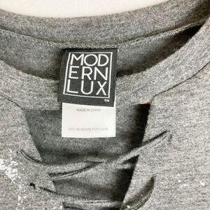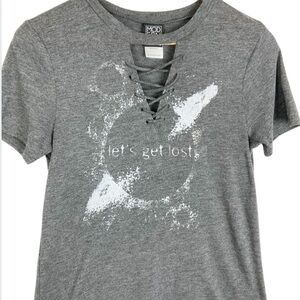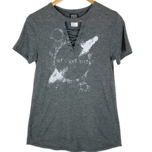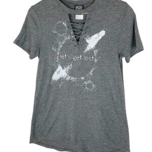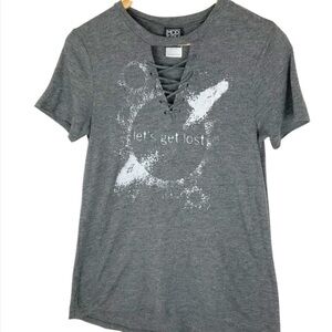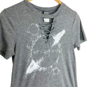 Modern Lux Short Sleeve T-Shirt. Grey base with white planet graphic. Short reads, “Let’s get Lost.” Has a whimsical vibe. Lace up cutout neck. Swoop neckline. Size XS. Style No: JT20270. 65% Polyester, 35% Rayon. Machine wash cold. Made in China.