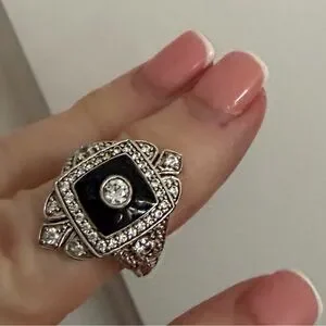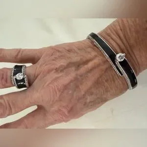 This stunning jewelry set features a sleek black and silver design. The set includes a bracelet and size 6 ring, both adorned with cz accents. Ideal for special occasions or everyday wear.