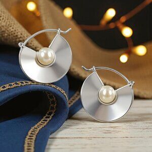 silver pearl statement earrings | modern minimalist jewelry | faux pearl half moon earrings | trendy silver earrings | boutique fashion earrings | bold lightweight earrings | 18k white gold plated accessories | dainty chic earrings | geometric glam jewelry | casual to formal earrings | aesthetic earring gift | everyday luxe style | unique pearl earrings womenโs boutique earrings