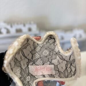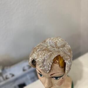Chic ivory cap-style hat from Modern Miss, featuring hand-sewn sequins over soft lace with sculpted wave-like form. A stunning midcentury piece that captures the glamour and elegance of 1950s fashion.