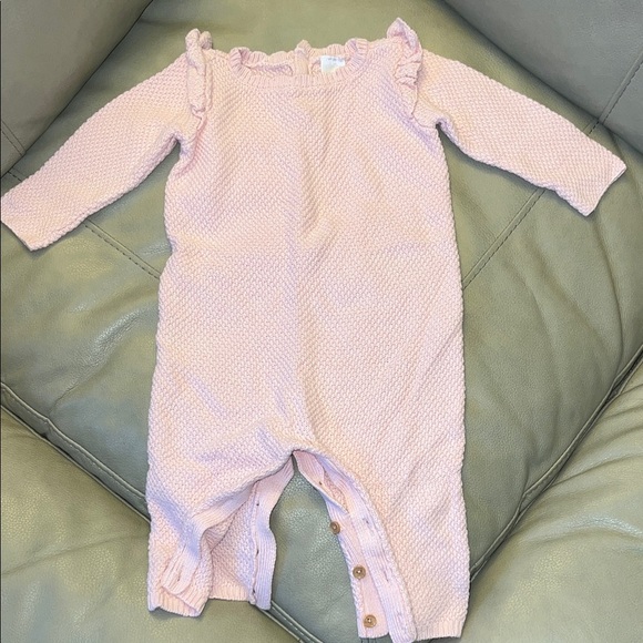 Charming light pink one piece with ruffled shoulders. Soft texture for cozy wear. EUC. Check out my other baby items for a great bundled deal! :)
