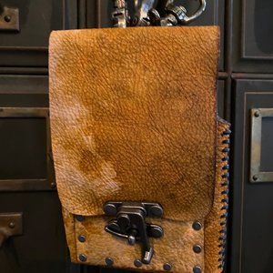 Modern Muse 61 cell phone case / Cross Body Bag. 4 1/2” x 7”. Custom made by leather artisan Melinda Hoffman. When a large hand bag won’t do - carry this - large pocket inside for cell phone and lip gloss. Pockets for license, credit cards and cash. Can be attached to a belt. Keys can be attached to the lobster clasp. One of a kind - custom made for my boutique. This has become the only bag I carry most of the time. No deals