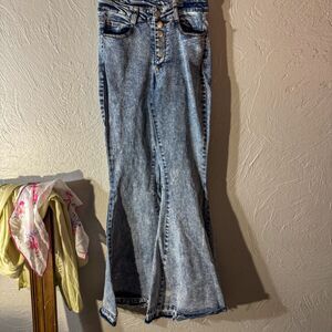 Peach Love, Jeans, Denim, Bell Bottom, Flare, Star, Acid Wash, High Rise, Button Fly, Bohemian, Boho, Festival, Indie, Western, Casual, Trendy, Raw Hem.