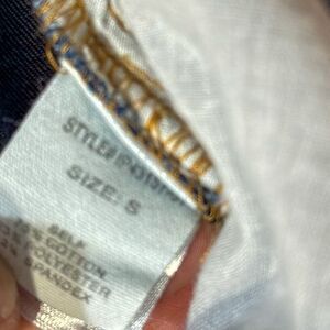 This is a stylish and playful pair of jeans from the brand "Peach Love." They feature a very trendy silhouette with a high-rise waist and an exaggerated bell bottom flare. The jeans have a cool, all-over acid wash and a modern button-fly closure. What really makes them stand out are the star-shaped, dark wash patches on the back pockets, which add a unique and eye-catching detail. The raw, frayed hem completes the modern bohemian look.