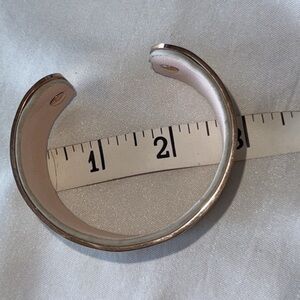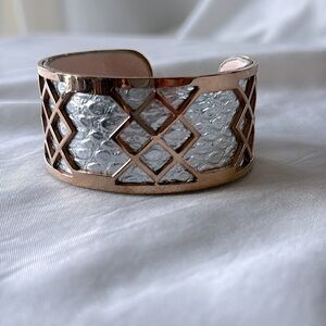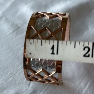 Unique Snake Skin Texture Rose Gold Tone Cuff Bracelet. Make a statement with this eye-catching two-tone cuff bracelet. The intricate rose gold-tone lattice design beautifully frames a captivating silver-tone interior with a unique snake-skin like texture. This wide cuff offers a blend of elegance and edgy style, perfect for stand-out accessorizing.