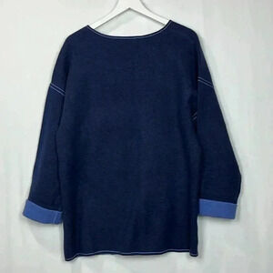 Modern Soul Womens Cardigan Navy Exterior Lighter Blue Interior L Open Front Long Lines 96% Wool Turn Back Cuffs Contrast Stitching Soft Beautiful Classy EUC