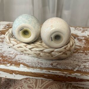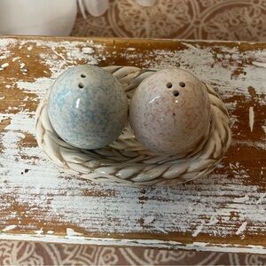 Add a pop of color to your Easter table with this modern southern home blue and pink egg-shaped salt and pepper shaker set. The set includes a salt shaker pepper shakers on a nest design dish. perfect for seasoning your holiday feast. The shakers feature a contemporary design that will complement any table setting and add a touch of whimsy to your decor. Use them all year round as a fun addition to your kitchen collection. Like new