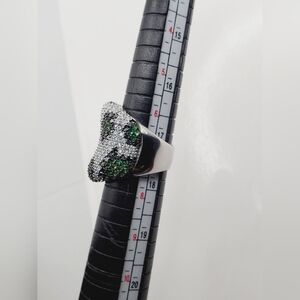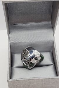 Turn heads with this dazzling 925 sterling silver pavé statement ring, designed in a bold dome silhouette. The surface is completely encrusted with sparkling simulated stones in brilliant white, vivid green, and deep black, creating a striking, abstract pattern that radiates luxury and individuality.