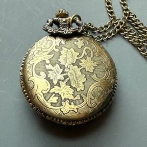 This is a new in package brass colored pocketwatch on long lobsterclaw clasp chain. Cover of watch has cutout gears and skeleton clock hands and back cover has etched leaves. Face itself has arabic numbers. I have several other pocketwatches listed if you want to bundle and save..just ask #steampunkjewelry #menspocketwatch #modernsteampunk