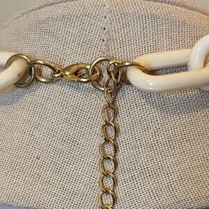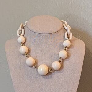 Cream acrylic bead and chain necklace with gold tone chain links. This necklace is pre-owned and has minimal wear on the lobster claw clasp and attached chain, but in overall good condition. It measures 15" with a 3" extender chain.