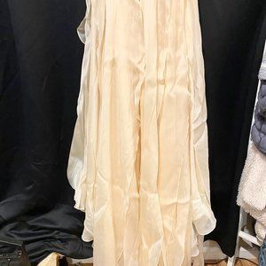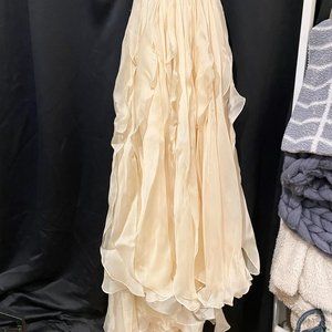 Modern Trousseau handmade dress. Worn as a wedding dress but since it is a champagne color, it would be stunning for any formal occasion! Size 2 with individual panels on the skirt that flow as you walk. This dress was worn once and comes with sash. After wearing it was professionally cleaned and preserved.