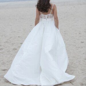This gown is perfect for the bride seeking a sophisticated yet modern style with classic touches. Worn with care and in excellent condition, it's ready to make another bride feel absolutely radiant.