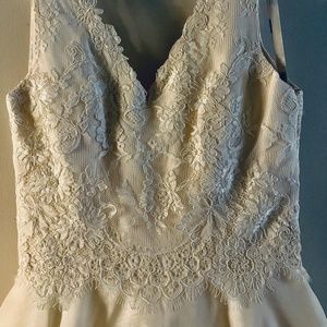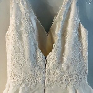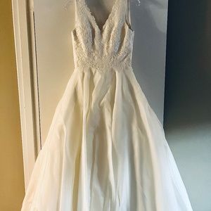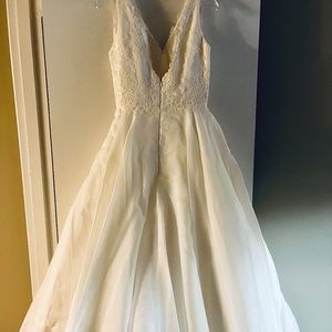 This dress was bought at a Modern Trousseau sample sale for $1600 and never worn (I fell in love with a different dress). Beautiful classic A-line with large tulle skirt and train. American- and hand-made.