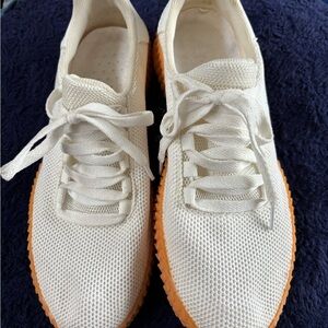These sneakers boast a breathable white mesh upper paired with a striking orange sole featuring a unique wavy pattern. The reinforced eyelets and traditional laces ensure a secure fit, while the modern silhouette offers both style and comfort.