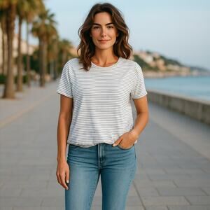 Elevate your casual wardrobe with this chic striped tee. Featuring a classic white and Blue Stripe design, it's perfect for everyday wear.