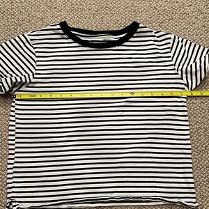 Stylish black and white striped boxy cropped short-sleeve t-shirt, perfect for everyday wear. Comfortable and trendy design. EUC without stains or holes. Offers a timeless and versatile look. Size Extra Small (XS) - measurements in photos. An updated version of the classic French nautical, marine-style Breton basic. Great transitional piece for the Fall! Love the look of this with black pants or jeans! 100% organic cotton.