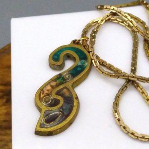 Modernist Brass Pendant Necklace with Stone and Resin Inlay, Retro Abstract Boho, Vintage Bohemian Artistry on Boxy Gold Tone Square Link Chain, Greek Artisan