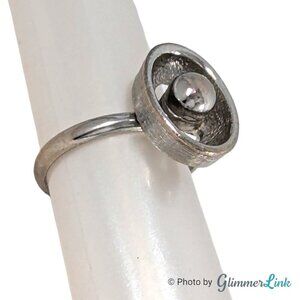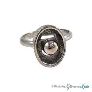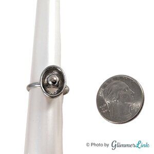 Abstract modernist silver tone ring featuring a oval cup with a domed dot in the center.