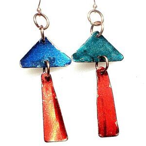 Modernist Geometric Blue Red Dangle Solid Pure Copper Earrings Bohemian Drop