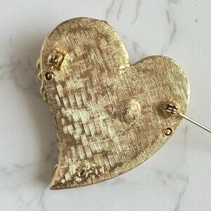 This vintage brooch captures the elegance of mid-century modernist design. The textured gold-tone heart is adorned with a delicate faux pearl, in juxtaposition to the more modernist details of the brooch.