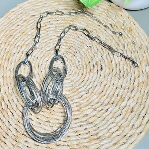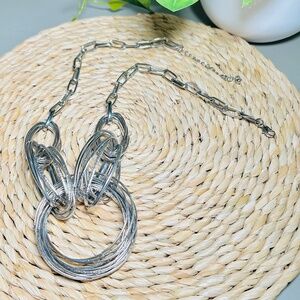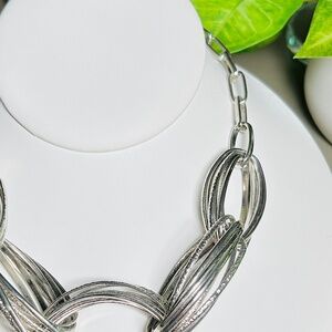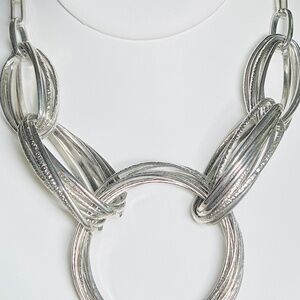 Modernist Large textured silver tone metal concentric interlocking circle bib necklace.