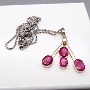 Modernist Pearl and Red Spinel Pendant in Sterling Silver on Silver Tone Rope Chain Necklace, Unique and Elegant