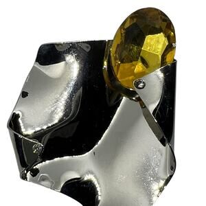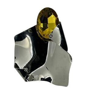 Striking modernist statement earring featuring a brilliant faceted yellow citrine-colored crystal set in a dramatic sculptural silver-tone metal frame. The unique angular design showcases asymmetrical, origami-inspired metalwork with clean, geometric lines and high-polish finish. Small clear rhinestone accents add subtle sparkle. This bold contemporary piece offers avant-garde styling with substantial presence and artistic flair. Perfect for elevating evening wear or creating a dramatic focal point for minimalist outfits. This listing is for a single earring, not a pair, ideal for those embracing the fashion-forward single statement earring trend popular on designer runways. Dating approximately to early 2000s with influences from architectural jewelry movements.