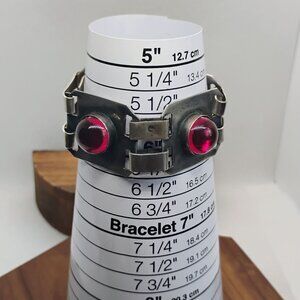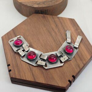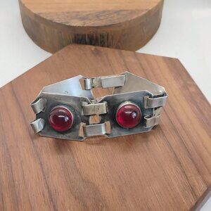 Modernist Signed MEK Sterling Link Bracelet w/Red Glass Cabochon Stones 44.5g