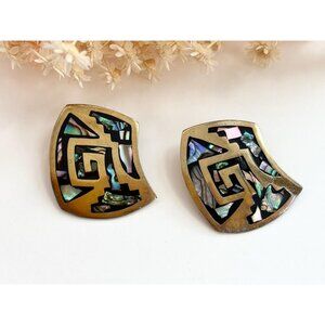 Modernist Sterling Silver Vermeil Taxco Mexican Abalone Vintage Clip On Earrings
