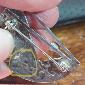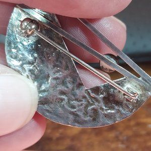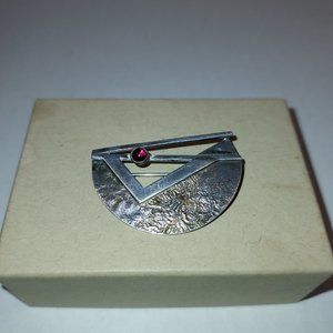 Modernist/Japanese Half Moon Handmade sterling Brooch with Garnet. Extremely Beautiful and well made. 6.3gm of sterling and signed by maker on the back. I can not read the etching but against the texture its hard to see. This brooch has some patina that give it depth.