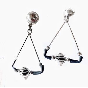 Fabulous new old stock modernist pierced earrings. Triangle dangles with runner accents with a twirling spiral center bead with black center. Silver tip, mint unused condition. 2” x 1.25”.