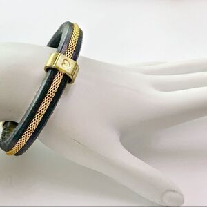 Fabulous modernist leather bracelet in black with embedded gold mesh chain. The end caps are Goldtone . There is a single thick loop at the front with an embossed heart. Sleek, simple and smart. Stamped inside genuine leather- made in EU. A classic addition to any wardrobe.